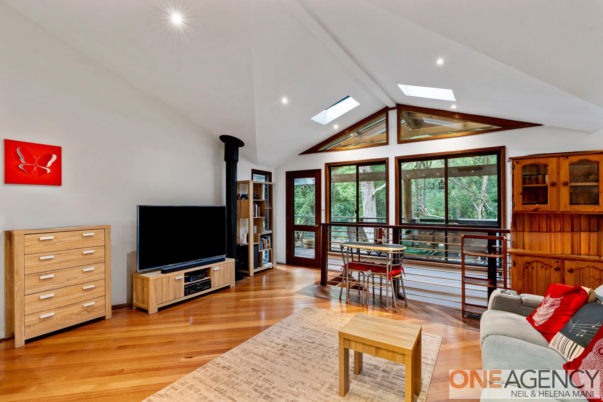 Upon entry, the upper level welcomes you with high vaulted ceilings and timber floors, enhancing the home’s warm, open ambience. An airy, open-plan layout combines the kitchen, dining, and living areas, bathed in natural light from skylights and expansive windows that frame scenic bush views. The kitchen is both functional and inviting, with timber benchtops, a breakfast bar, and a serene outlook, making it ideal for everyday living and entertaining alike.