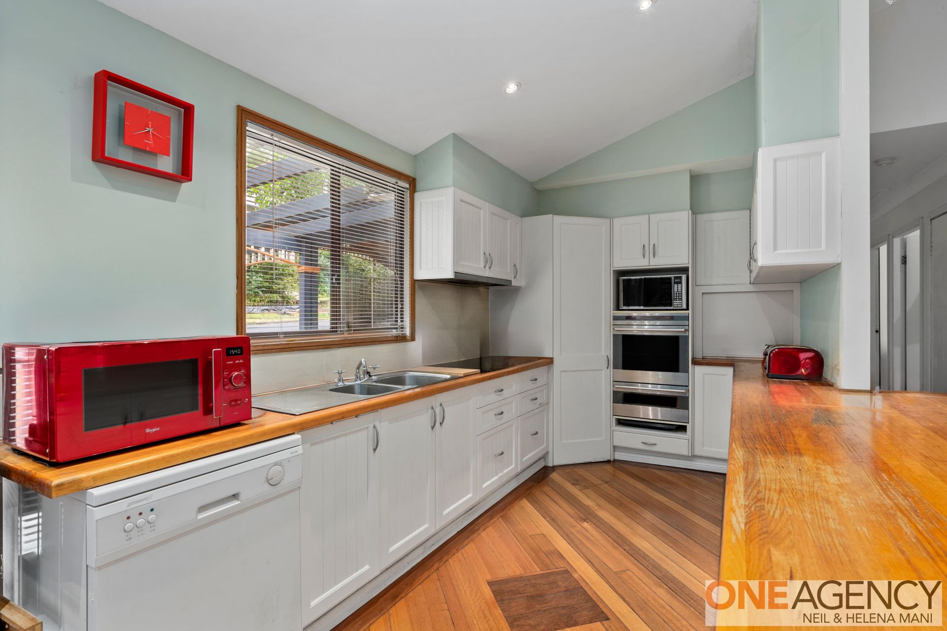 * Spacious kitchen with stainless steel appliances, including dishwasher, oven, double sink, electric cooktop, timber benchtops, breakfast bar, and ample storage